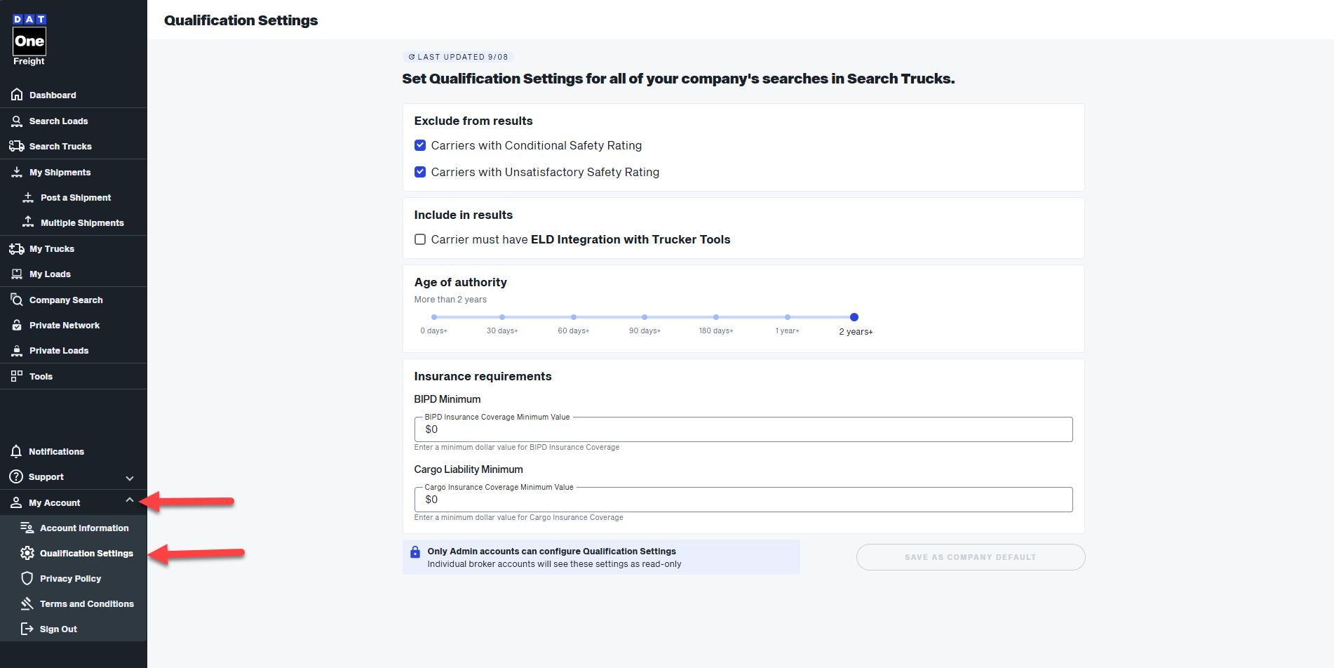 Admins can create and manage Qualification Settings, which can then be applied across the DAT ecosystem by all users on the account.